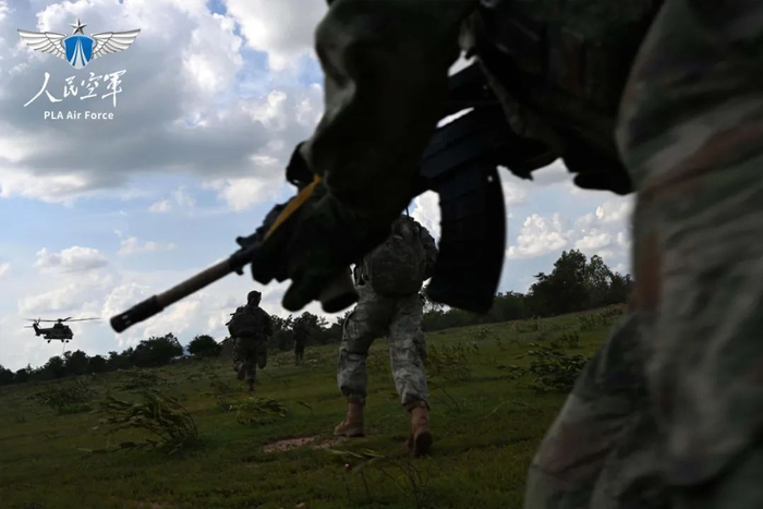 8月22日,在泰国空军乌隆基地,参加“鹰击-2024”中泰空军联合训练的中国空军特战分队与泰国空军特战分队联合进行搜救。