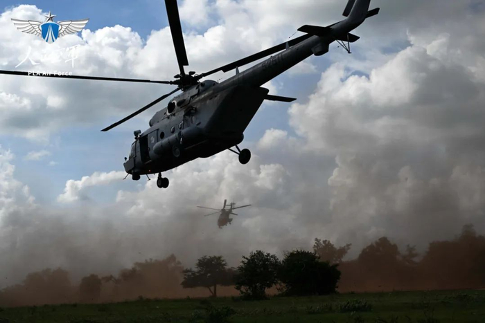 8月22日,在泰国空军乌隆基地,参加“鹰击-2024”中泰空军联合训练的中国空军直升机与泰国空军直升机共同飞赴训练地域。