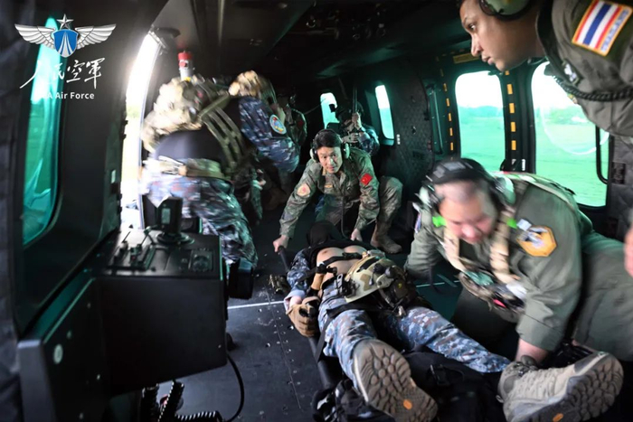8月26日,参加“鹰击-2024”中泰空军联合训练的中国空军医疗救护人员与泰国空军医疗救护人员在直升机上救护“伤员”。