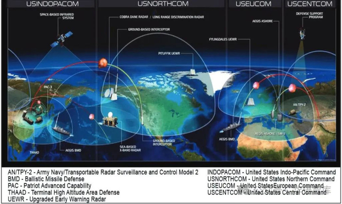 该图展示了美国军队导弹防御架构在美国境内和世界其他地方前沿部署的覆盖范围。