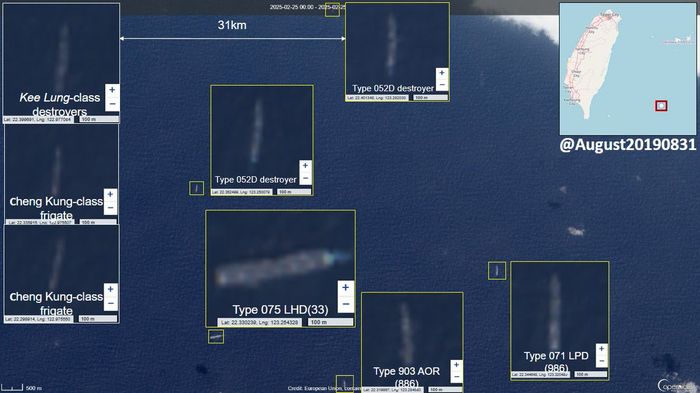 而在此前一天,台军“基隆”级驱逐舰在台湾东部海域和我075型两栖攻击舰对峙。社交媒体上流传的2月25号的卫星图像显示,解放军075型两栖攻击舰领衔的两栖打击群,包括1艘071型两栖船坞登陆舰、2艘052D型驱逐舰和1艘903型综合补给舰位于台岛以东约250公里处活动,台军1艘基隆级驱逐舰和2艘成功级护卫舰位于台岛一侧进行监视。