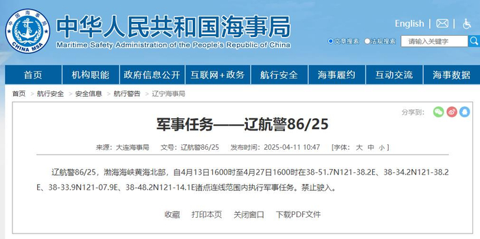 央视网消息:据大连海事局,辽航警86/25,渤海海峡黄海北部,自4月13日1600时至4月27日1600时在38-51.7N121-38.2E、38-34.2N121-38.2E、38-33.9N121-07.9E、38-48.2N121-14.1E诸点连线范围内执行军事任务。禁止驶入。