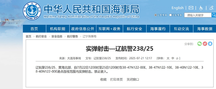 央视网消息:据中华人民共和国海事局网站消息,大连海事局发布航行警告,自7月22日12时至25日12时,黄海北部部分海域实弹射击,禁止驶入。