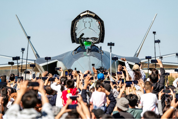 此次航展,歼-20成四机编队带来了精彩展示。像欢送英雄一般,每个人都在努力地挥手。看到这一幕,飞行员也打开鸭翼,向大家致意。
