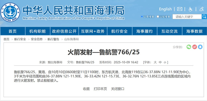 央视网消息:据中国海事局网站消息,烟台海事局发布航行警告,10月10日6时至11日11时,黄海部分海域进行火箭发射,禁止船舶驶入。