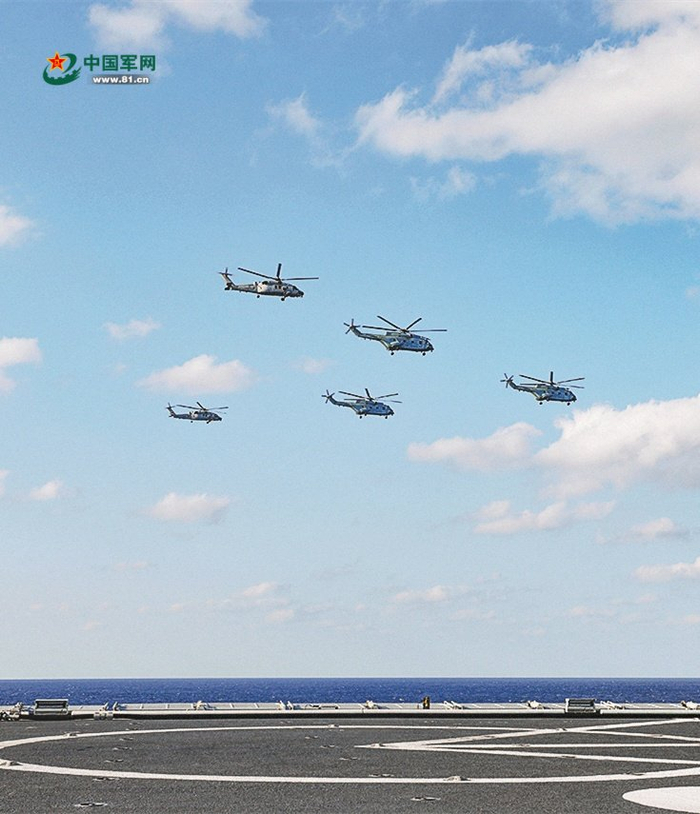 “舰载直升机起降部署!”接到命令,舰载直升机转运小组快速将舰载直升机转运至甲板。铁翼飞旋,数架直升机腾空而起,新一轮训练在海天之间展开。