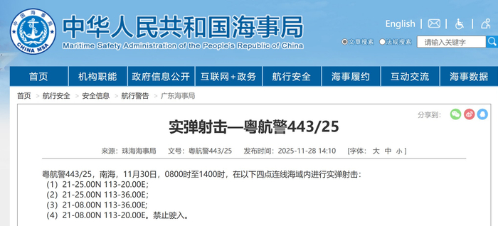 央视网消息:据中国海事局网站消息,珠海海事局发布航行警告,11月30日8时至14时,南海部分海域进行实弹射击,禁止驶入。
