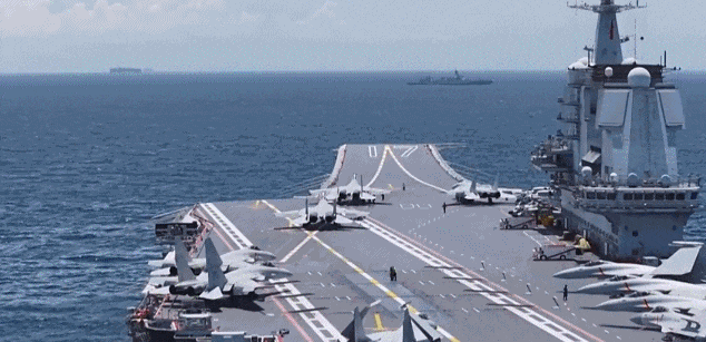 2024年10月,辽宁舰、山东舰编队首次开展双航母编队演练。歼-15战机组成楔形编队飞过双航母编队上空。