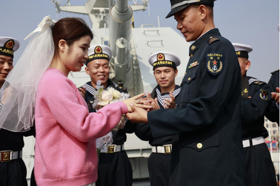 这场迟到的婚礼,没有奢华的布置,却有着最真挚的情感,没有繁复的流程,却有着军营独有的浪漫。护航路上,他们守护着远海的和平,而身后的家人和战友,则守护着他们的幸福。