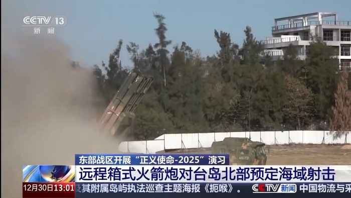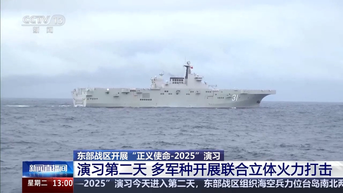 今天,“正义使命—2025”演习进入第二天,东部战区组织海空兵力位台岛南北两端相关海域,联合开展查证识别、警告驱离、模拟打击,以及对海突击、防空反潜等科目演练。同时,东部战区陆军部队对台岛北部相关海域,实施远程火力实弹射击,取得了预期效果。