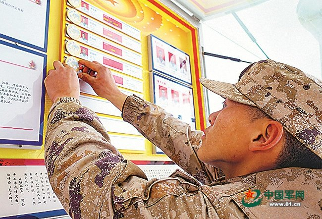 被评为“岱崮尖兵”的战士,将奖章放置到连队荣誉墙上。